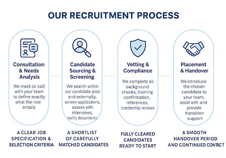 Every care environment is unique. Whether you need support staff for a specialised unit, a carer for a private household, or a companion for a client with specific needs, our recruitment team works consultatively with you. We listen carefully to your requirements—skills, shift patterns, values—and present candidates who meet them.